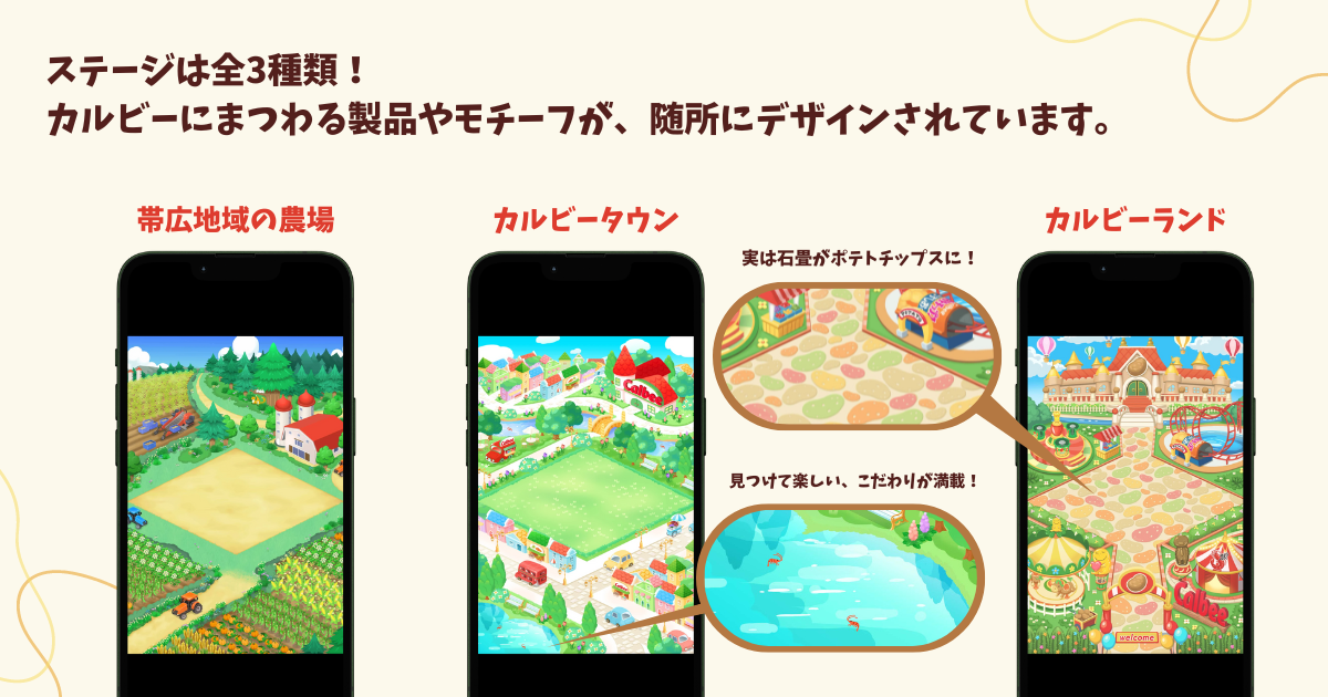 ゲームには、カルビーのキャラクターと世界観を表現した3つのエリア、「帯広地域の農場」「カルビータウン」「カルビーランド」が用意されています。ユーザーは、カルビーのキャラクターとともに農作物を収穫したり、アイテムを獲得して自分の農場をカスタマイズしたりできます。