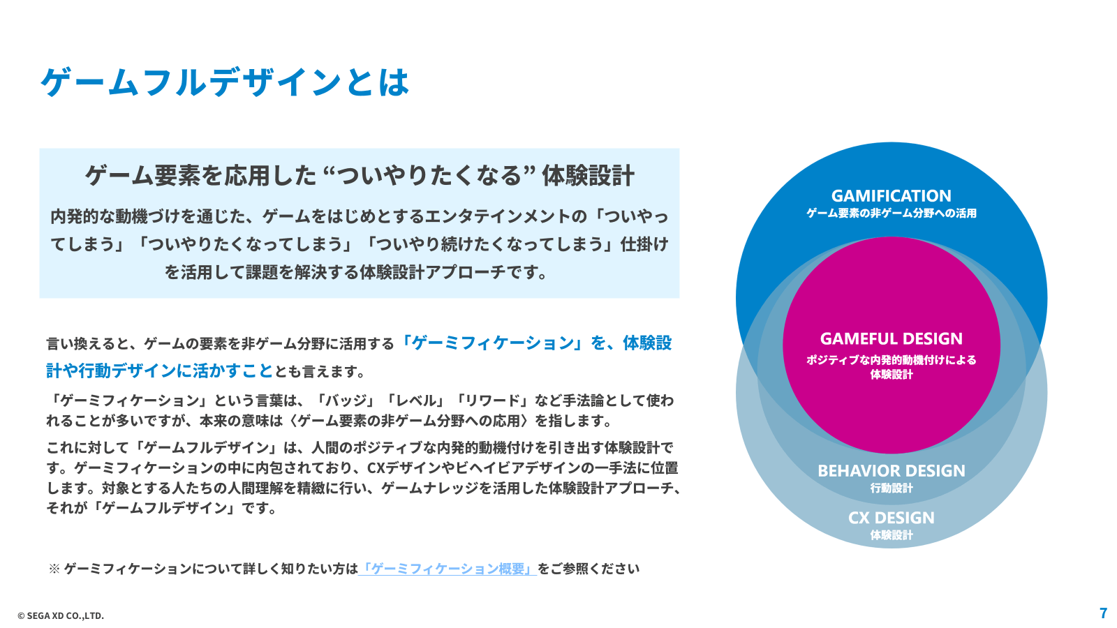 「ゲームフルデザイン」の本質から活用方法まで、基礎知識を網羅的にまとめています。非ゲーム分野でゲーム要素を取り入れる「ゲーミフィケーション」との違い、近年注目される背景、そしてゲームフルデザインの得意領域・不得意領域までを基礎から解説。さらに、生活者の体験を瞬間UXと習慣UXの2軸で捉える独自のアプローチを、フレームワークとともに紹介します。課題解決にどのように応用できるのか、実際の事例を交えながら具体的に説明します。