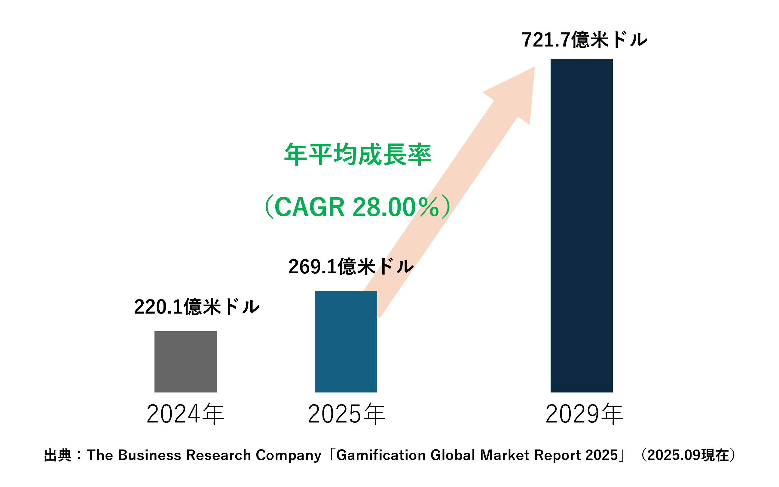 グローバルのさまざまな産業において、ゲームの仕組みや要素を活用するゲーミフィケーションの活用が普及しています。2025年現在の市場規模は261.9億ドルで、2029年にはその2倍以上の700億ドルを超えると予想されています(下図)。こうしたデータから見ても、ゲーミフィケーションの市場が拡大傾向にあることは間違いありません。