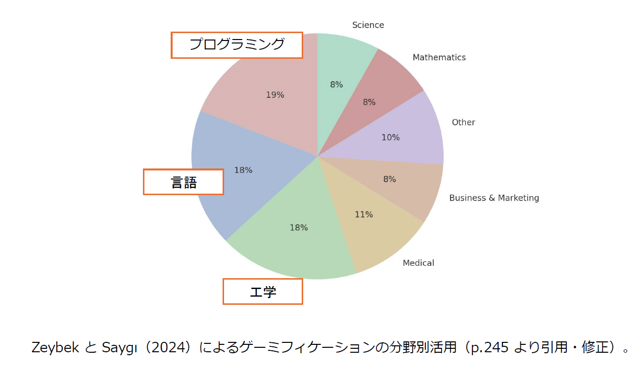 研究結果データベース「ZeybekとSaygi(2024)」を基に、ゲーミフィケーションを活用している研究分野を見ると、プログラミング・言語教育・工学系などがそれぞれ20%程度とITや数学的なアプローチが非常に多いです。ただ、近年は医療やビジネスに置ける活用も増加傾向にあり、10%程度と数値にも現れています。