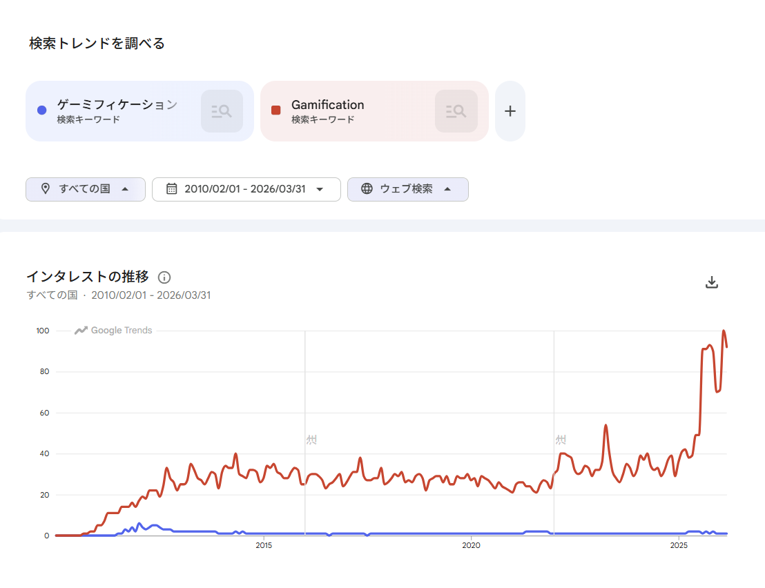 では日本はというと、海外との浸透度には大きな差があるようです。ここでGoogleトレンドのデータを見ると、その様子が一目瞭然です。「Gamification(英字)」の検索人気度が2010年以降大きく伸びているのに対し、日本語の「ゲーミフィケーション」は、2011~12年ごろに少し山ができてから、それほど検索数は延びていません(下図)。