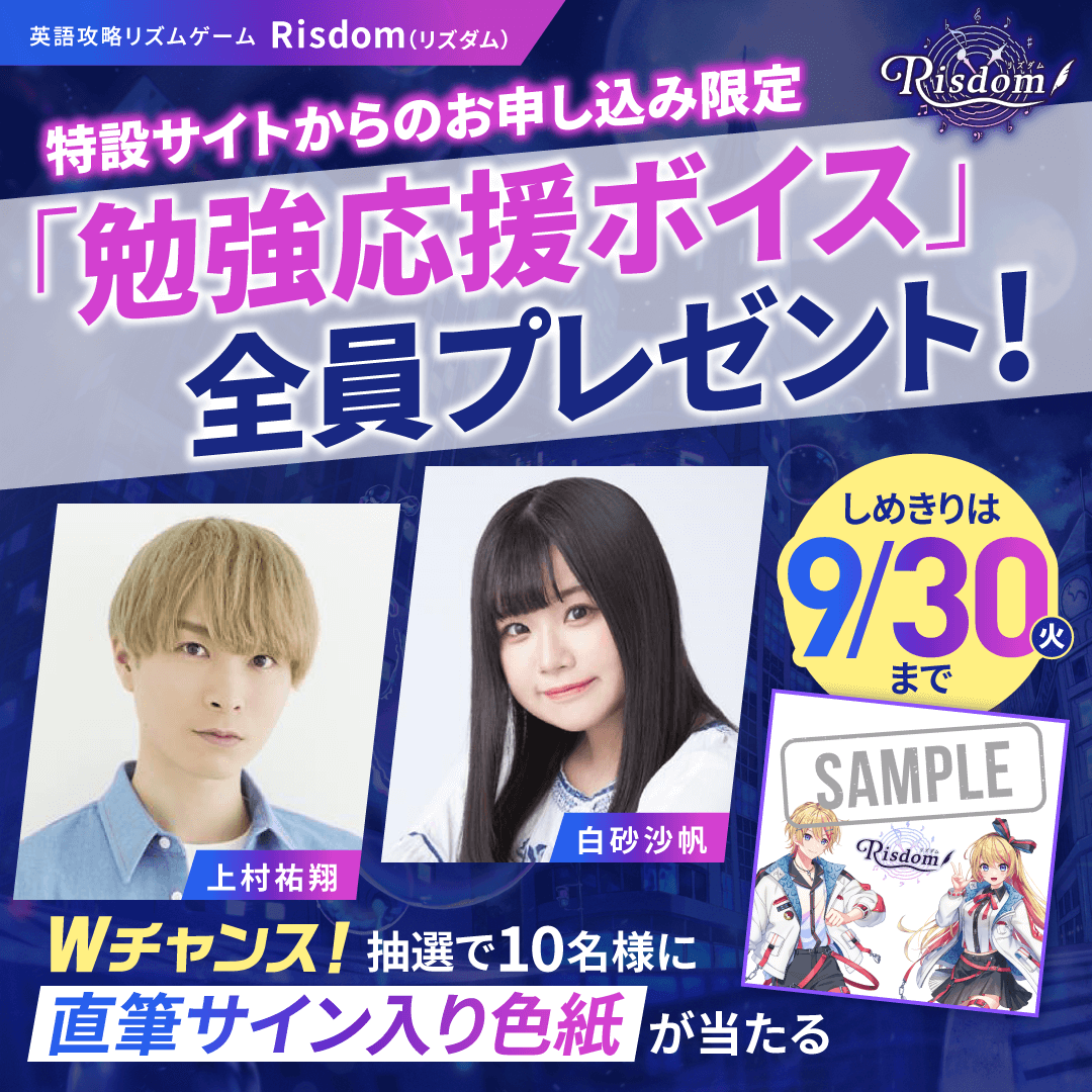 ゲーミフィケーション事業を展開する株式会社セガ エックスディー(本社:東京都新宿区、代表取締役 社長執行役員CEO:谷 英高、以下:セガXD)と株式会社ベネッセコーポレーション(本社:岡山県岡山市、代表取締役会長兼社長:岩瀬 大輔)が提供するゲーム型英語学習アプリ「Risdom(リズダム)」は、2025年9月でサービス開始から1.5周年を迎え、累計50万ダウンロードを突破したことを記念し、2025年9月30日(火)までの期間、人気声優のサイン入り色紙が当たる豪華キャンペーンを開催します。