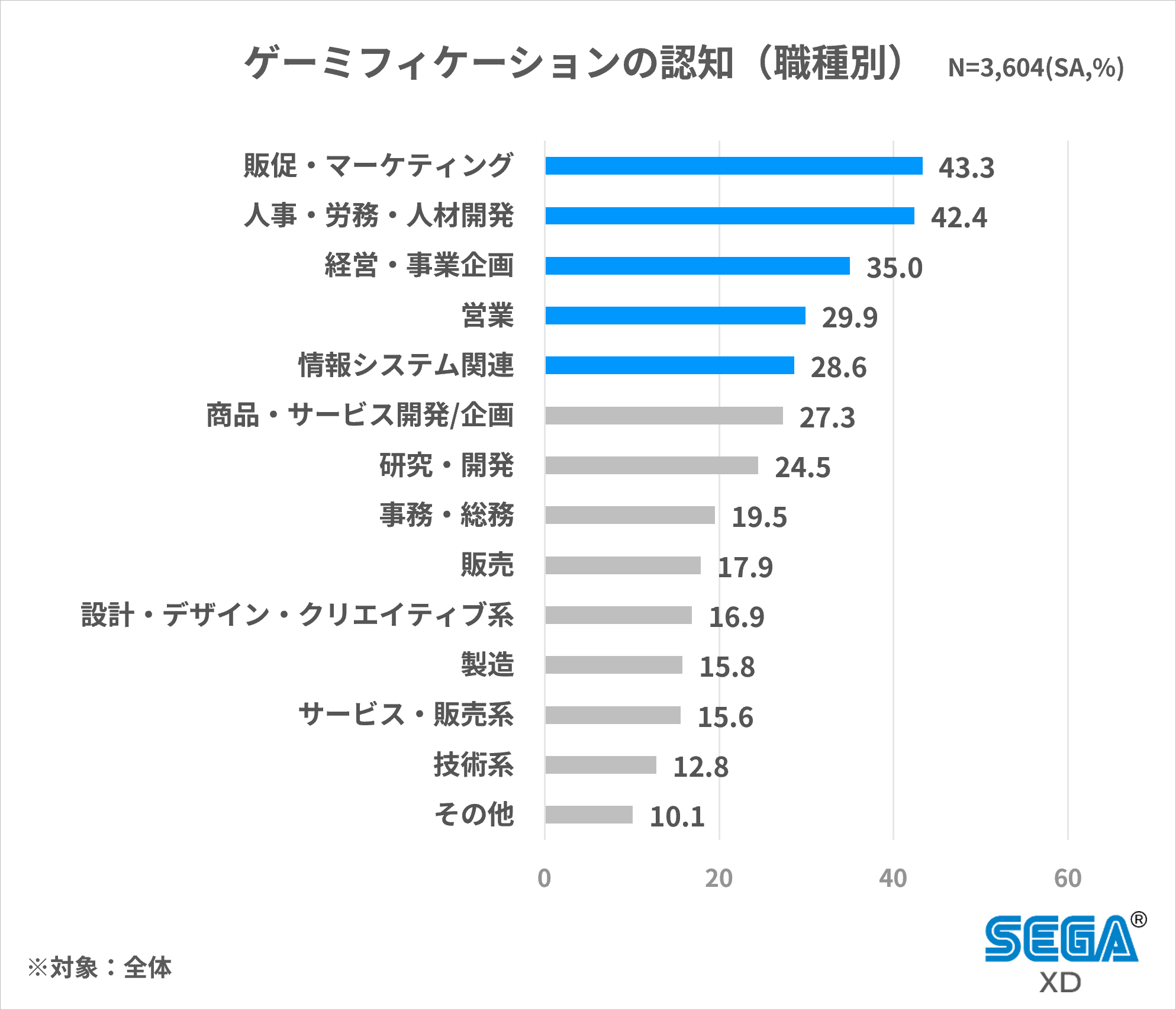「ゲーミフィケーションの認知・活用」についての調査では、ゲーミフィケーションを5人中1人程度(19.0%)が認知と、前年度比で3.0pt増加していることが分かりました。職種別にみると「販促・マーケティング」が43.3%と最も多く、企画職を中心に認知度が高く、前年度と同様の傾向でした。