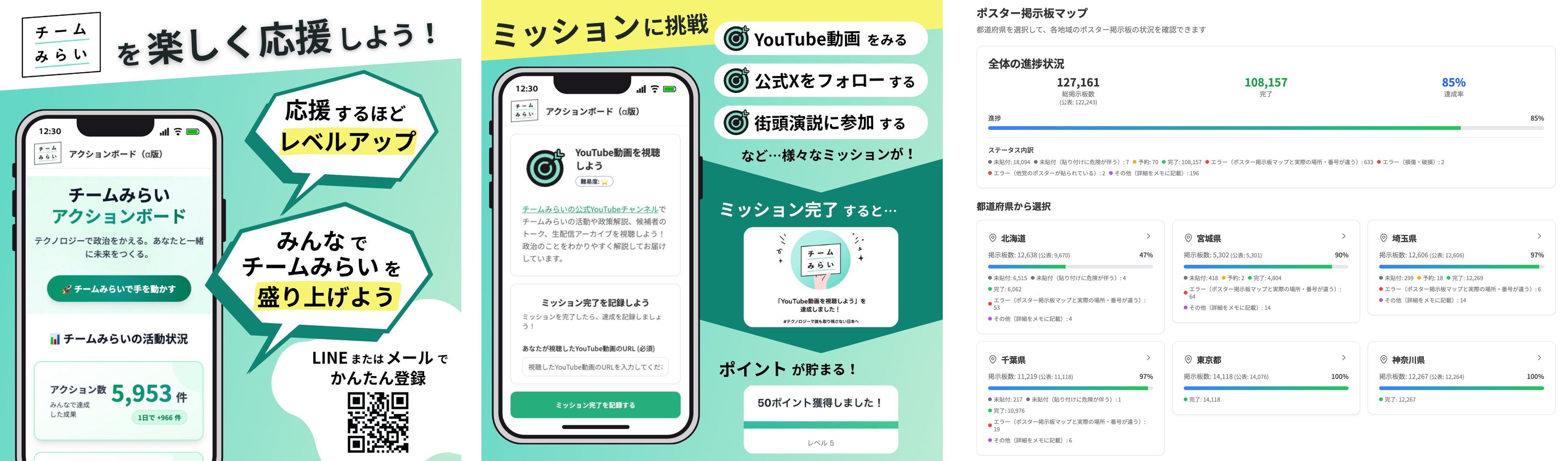 アクションの可視化やランキング、バッジ機能を通じて、全国のサポーターたちが楽しみながら政治活動に参加できる環境を提供することを目的に作られたアクションボード。政治参加のハードルを下げ、市民との対話を育んでいく取り組みとして実施。