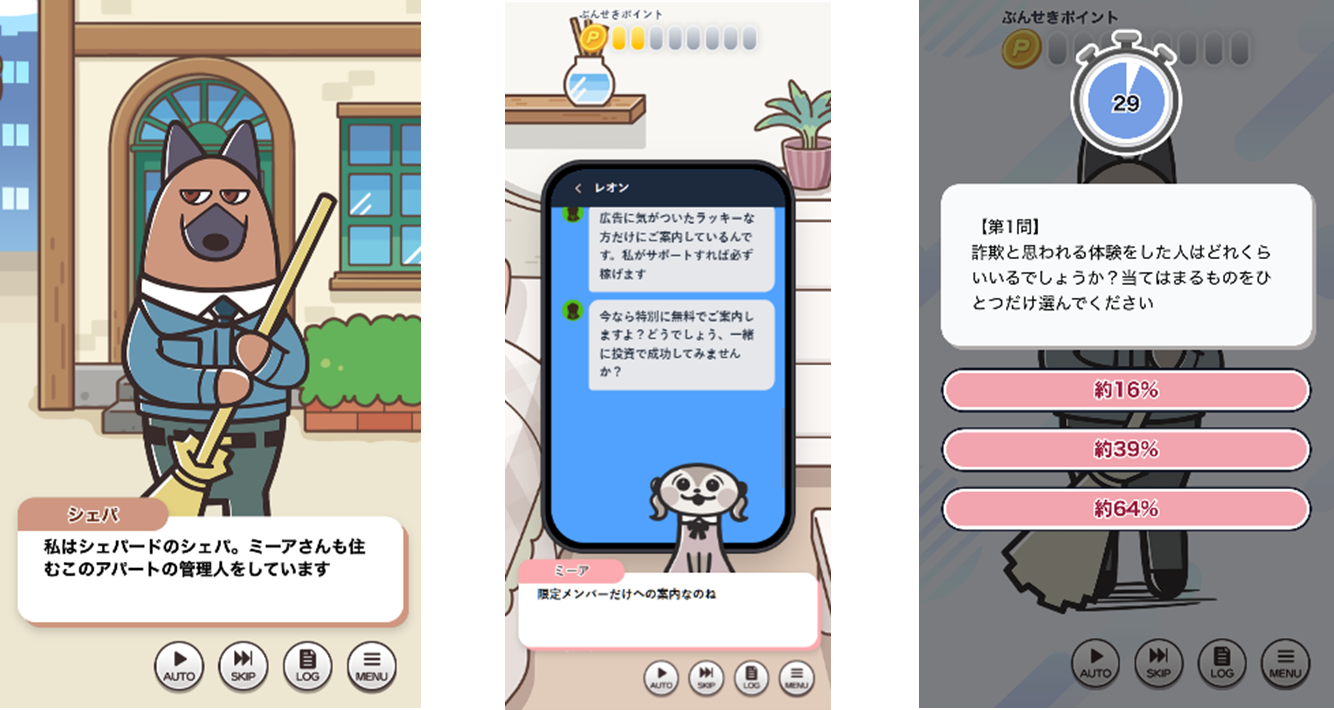 各キャラクターが遭遇する詐欺の種類や状況は異なり、プレイヤーはその被害を追体験しながらクイズ形式で振り返ることで、詐欺についての知識を深めるとともに、詐欺対策を“自分ごと”として考えるきっかけとなります。